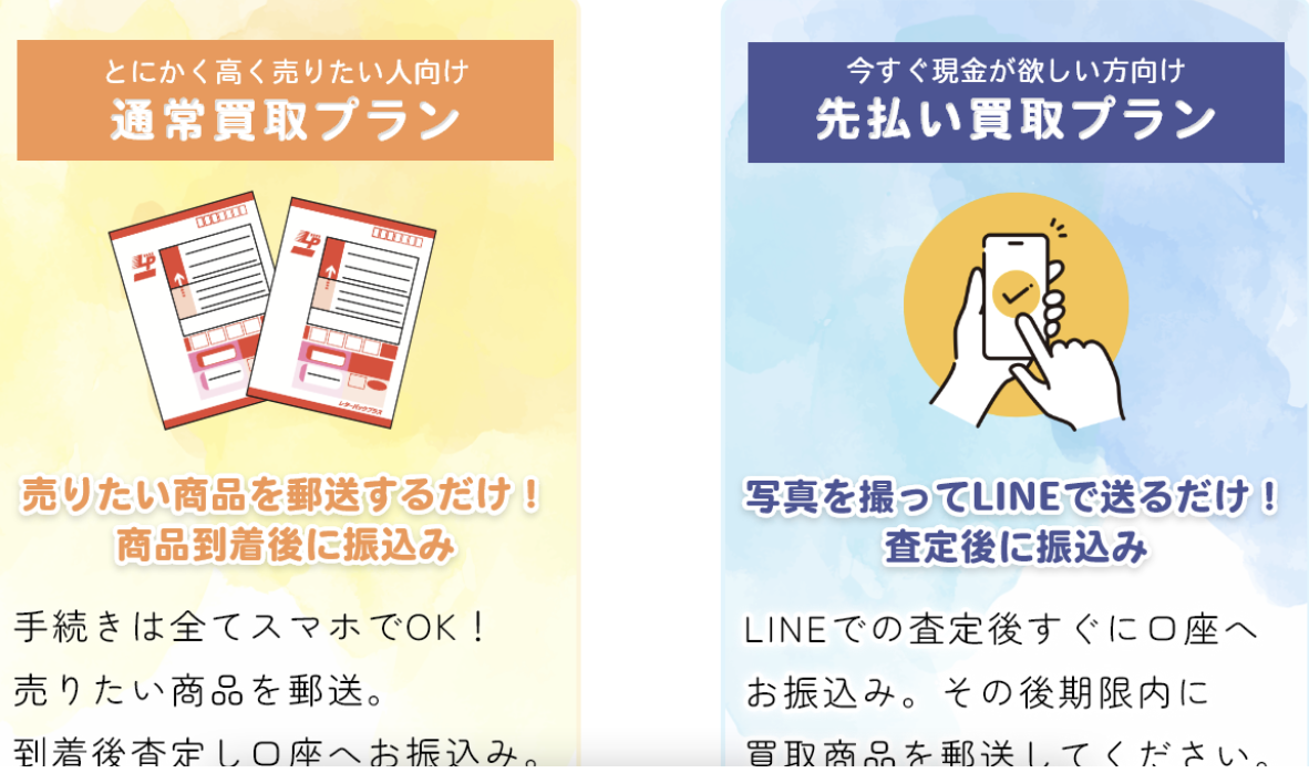 先払い買取を扱っている業者さんのホームページには必ずと言って良いほど「買取率」と「買取プラン」が記載しています。プランは主に2つ「先払い買取」と「郵送買取」の二つ項目になりますが使用する目的によってメリット、デメリットがあります。