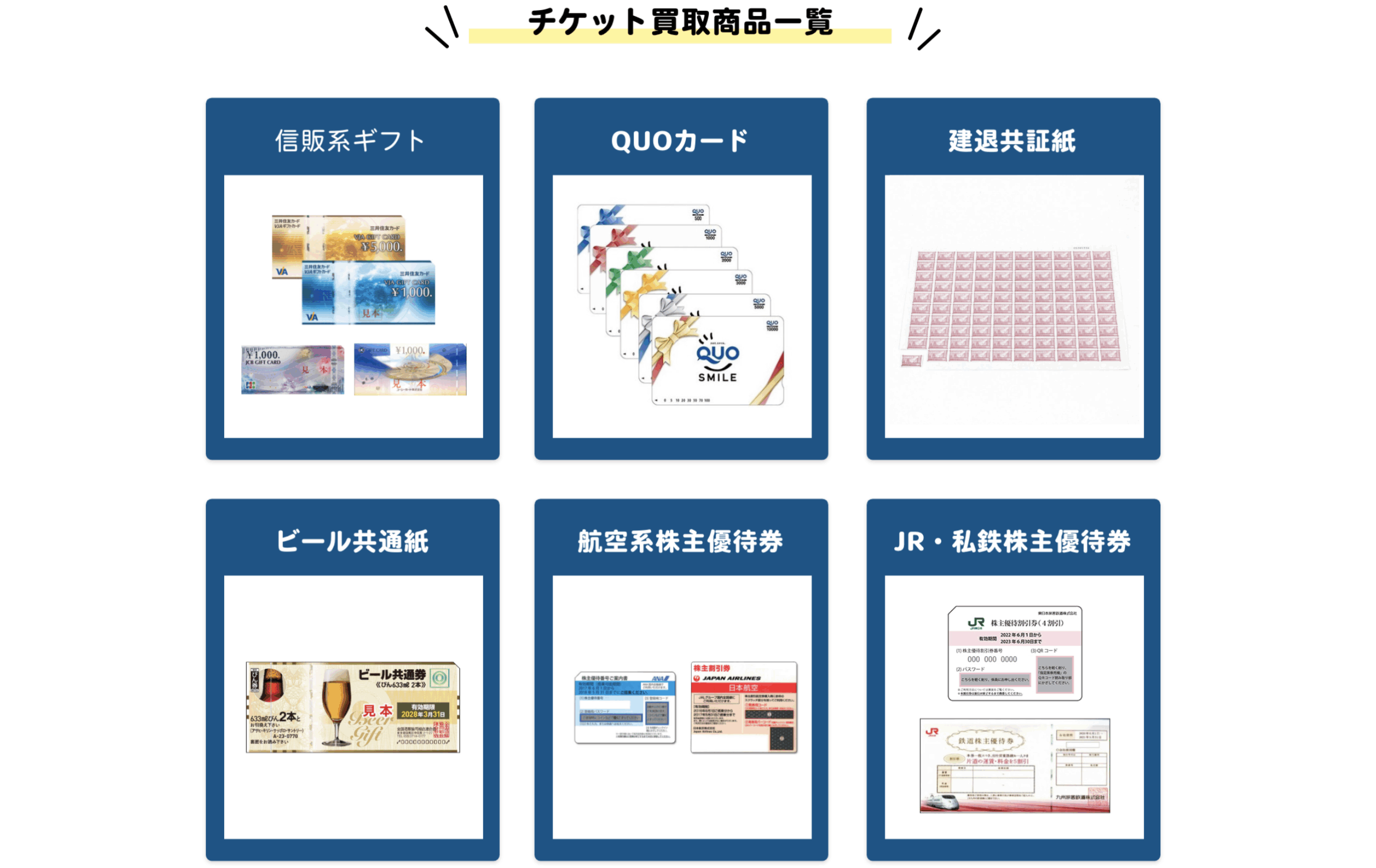 | 買取対象品 | 商品券・収入印紙・株主優待券など多数 | 商品券・収入印紙・株主優待券など多数 |