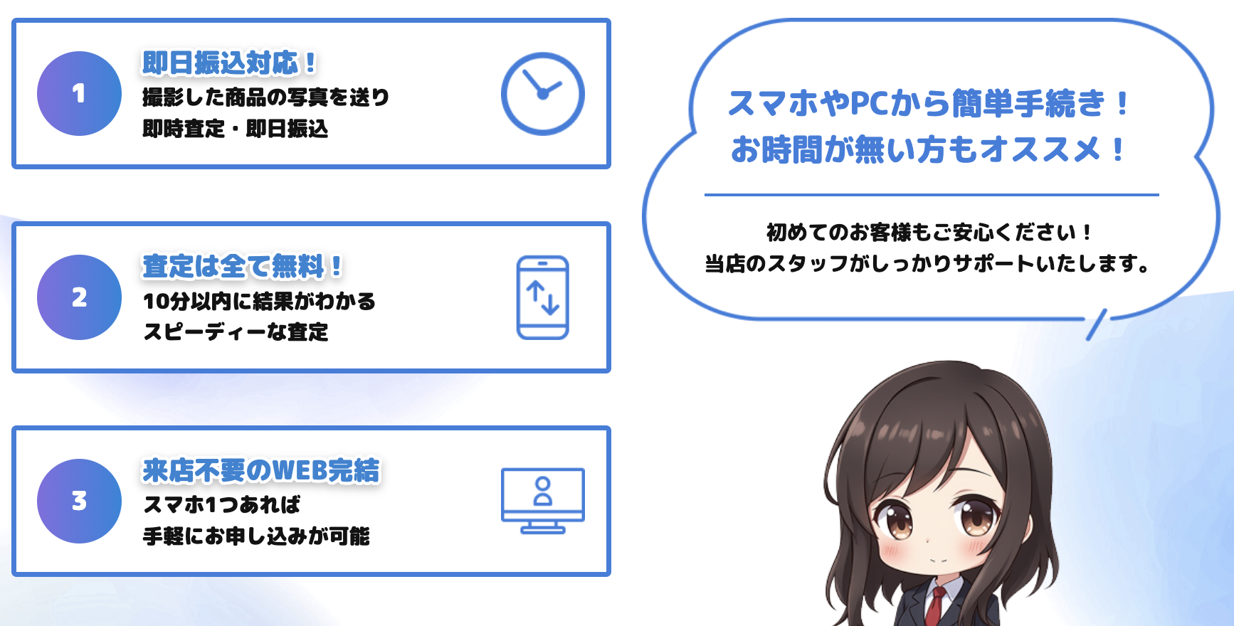 「初めは不安だったけど、スタッフの対応が早くて親切で驚きました。送ってから振込までがとても速くて、金額にも大満足です。次も利用したいと思います!」