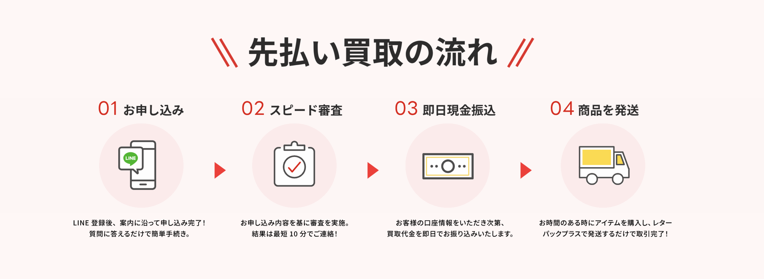 - 写真で査定→お金が先に入金→後から商品を発送